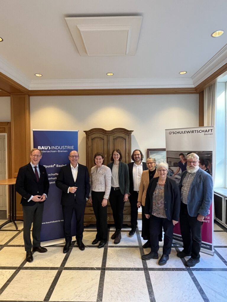 In einer kleinen Feierstunde wurde die Bildungspartnerschaft zwischen der Bauindustrie Niedersachsen-Bremen und SCHULEWIRTSCHAFT Bremen am 15. Januar 2026 im Bremer Industriehaus unterzeichnet. Teilgenommen haben Jörn P. Makko, Hauptgeschäftsführer des Bauindustrieverbandes Niedersachsen-Bremen, und Cornelius Neumann-Redlin, Hauptgeschäftsführer der Unternehmensverbände im Lande Bremen sowie Julia Heimann, Ricarda Kneiser, Dr. Veit Sorge, Steffen Post, Anja Krüger und Ulrike Tisborn für das Netzwerk SCHULEWIRTSCHAFT Bremen.